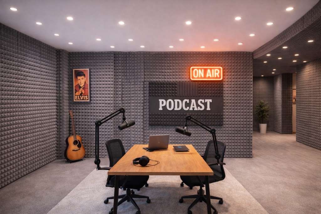 • Fasilitas Utama: Ruang kedap suara yang dilengkapi dengan mikrofon kondensor, mixer audio, kamera profesional, lighting, serta headphone untuk monitoring.